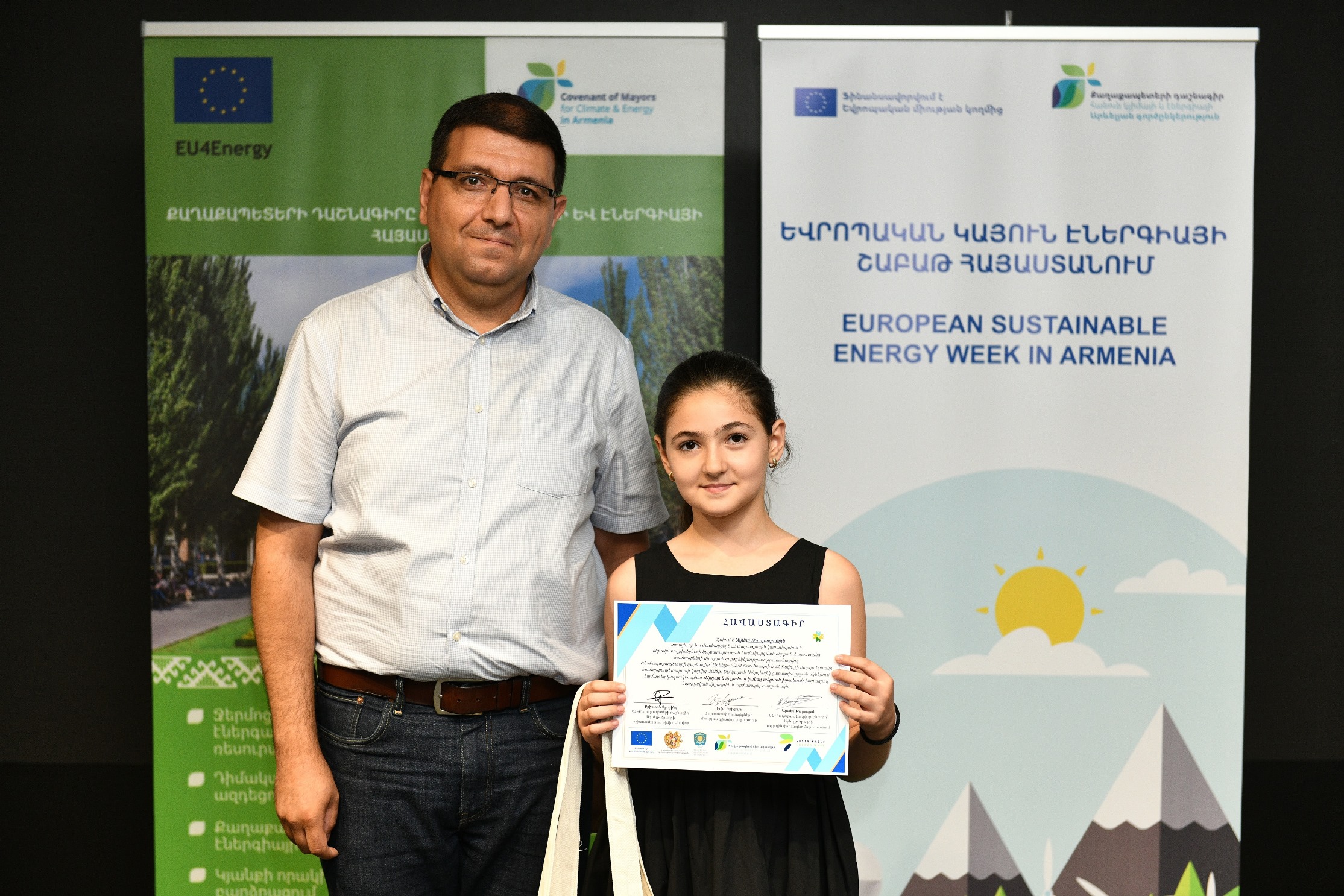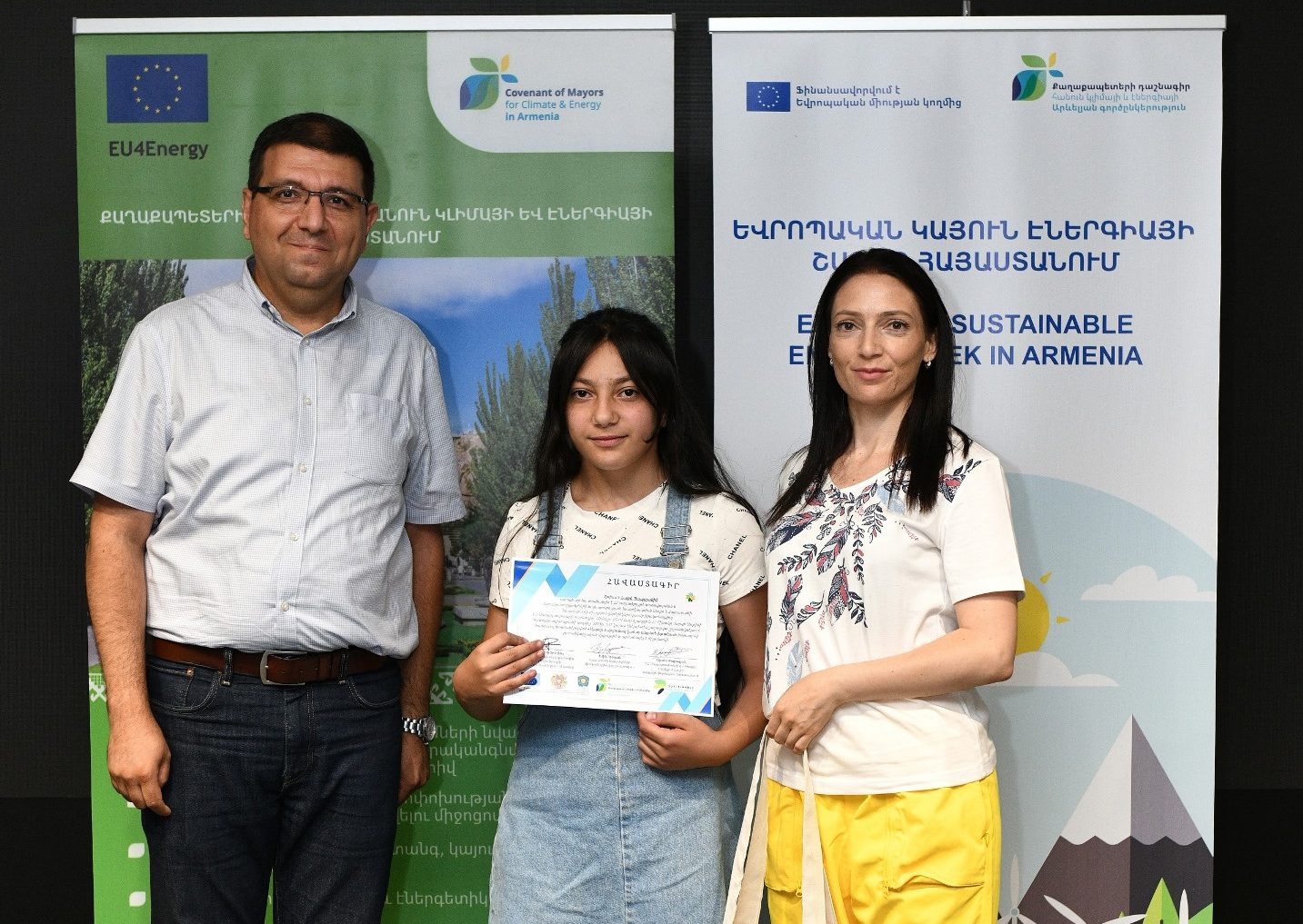 The Yerevan ceremony brought together over 50 participants from fifteen communities, including local authority representatives, contest winners, their families and teachers, and the CoM East Armenia team. In his opening remarks, Mr Artem Kharazyan, CoM East Country Expert for Armenia, welcomed participants and set the tone for the celebration. Mrs Tatevik Harutyunyan, Local Communication Expert, outlined the objectives of the Covenant of Mayors, the CoM East project, and EUSEW, and presented a summary of Armenia’s events and contests.